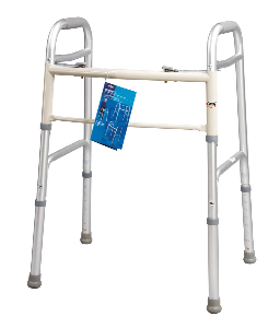 The Dual Paddle Folding Walker has handles that lock into place when the walker is opened. The ergonomic paddles can be depressed with the palm of the hand for easy folding and unfolding one side at a time. The adult size adjusts in height from 30 to 37 in one-inch increments.