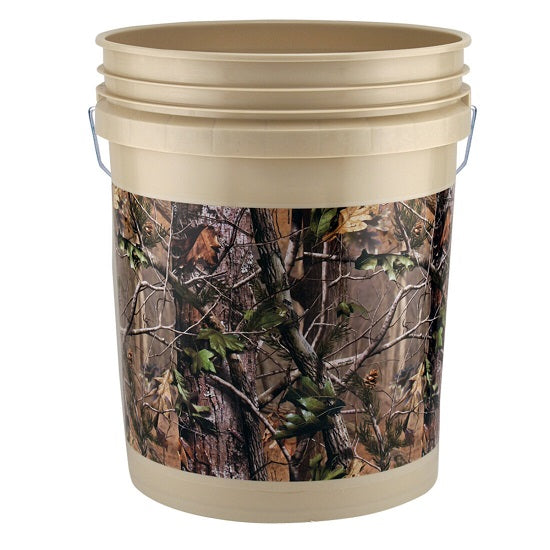These buckets are made from durable plastic. They are ideal for outdoor recreational, paint mixing, topsoil hauling, storage, and much more. 17866 prominently features a camouflage design. The Realtree APG bucket pattern is lighter, more open, neutral-toned, and more contrast than the competition. It's ideal for hunting camo.